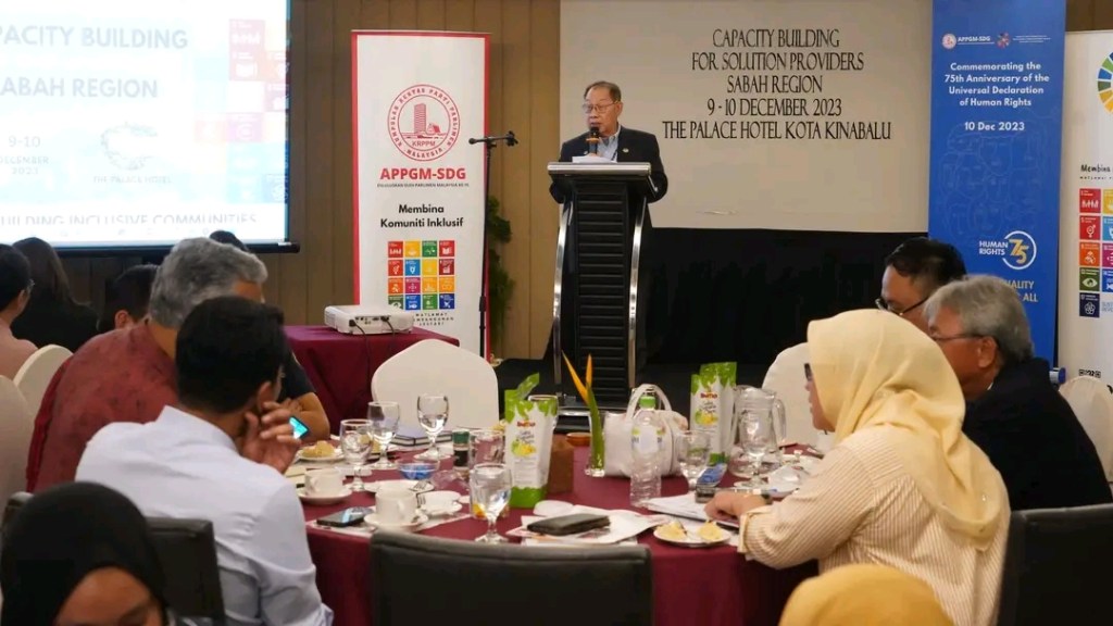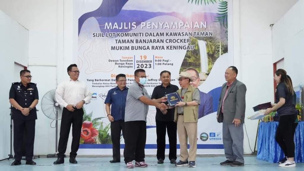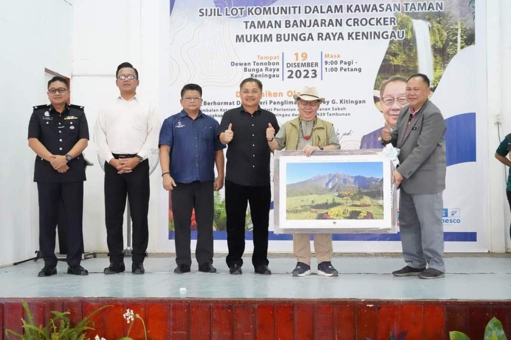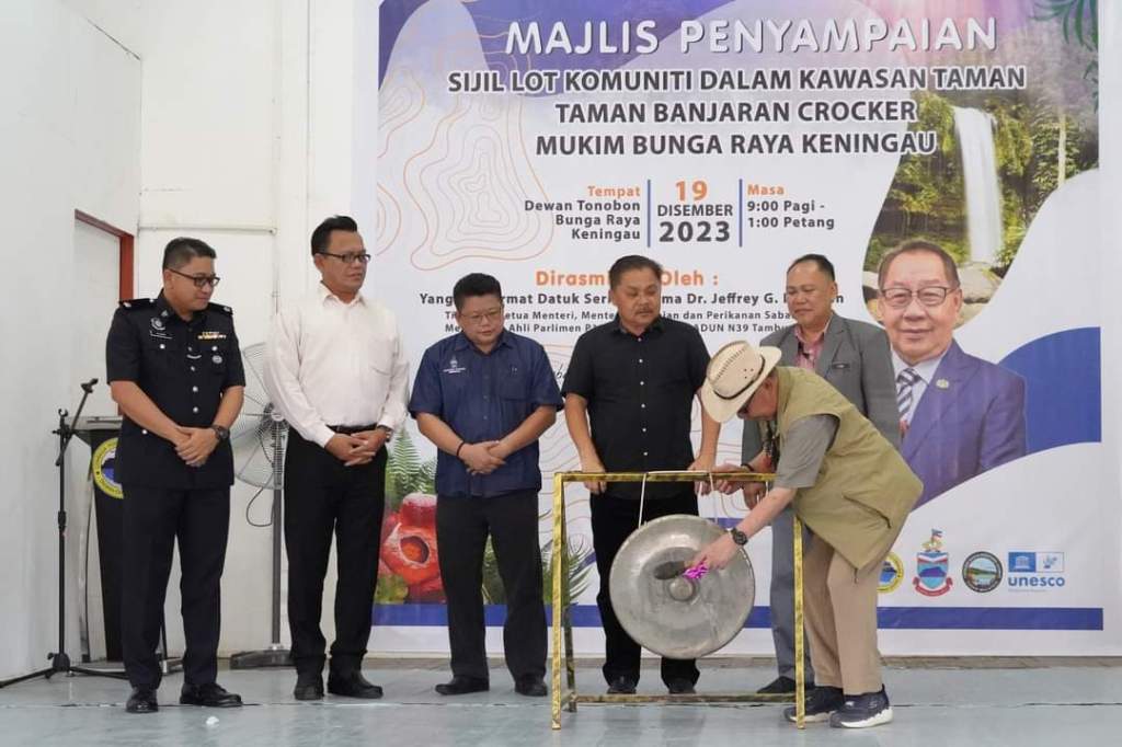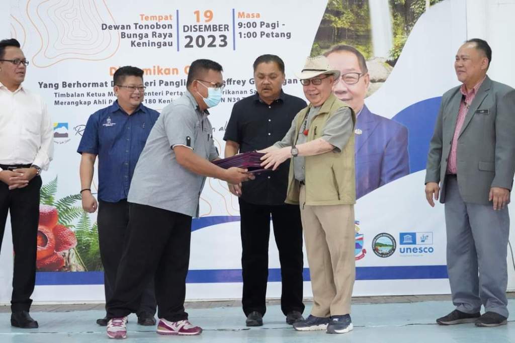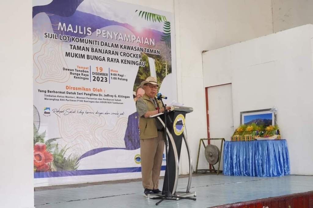 KENINGAU: Timbalan Ketua Menteri merangkap Menteri Pertanian, Perikanan dan Industri Makanan Datuk Seri Panglima Dr Jeffrey G Kitingan menyampaikan Sijil Lot Komuniti kepada 74 pengusaha di dalam kawasan Taman Banjaran Crocker Mukim Bunga Raya, Keningau hari ini.